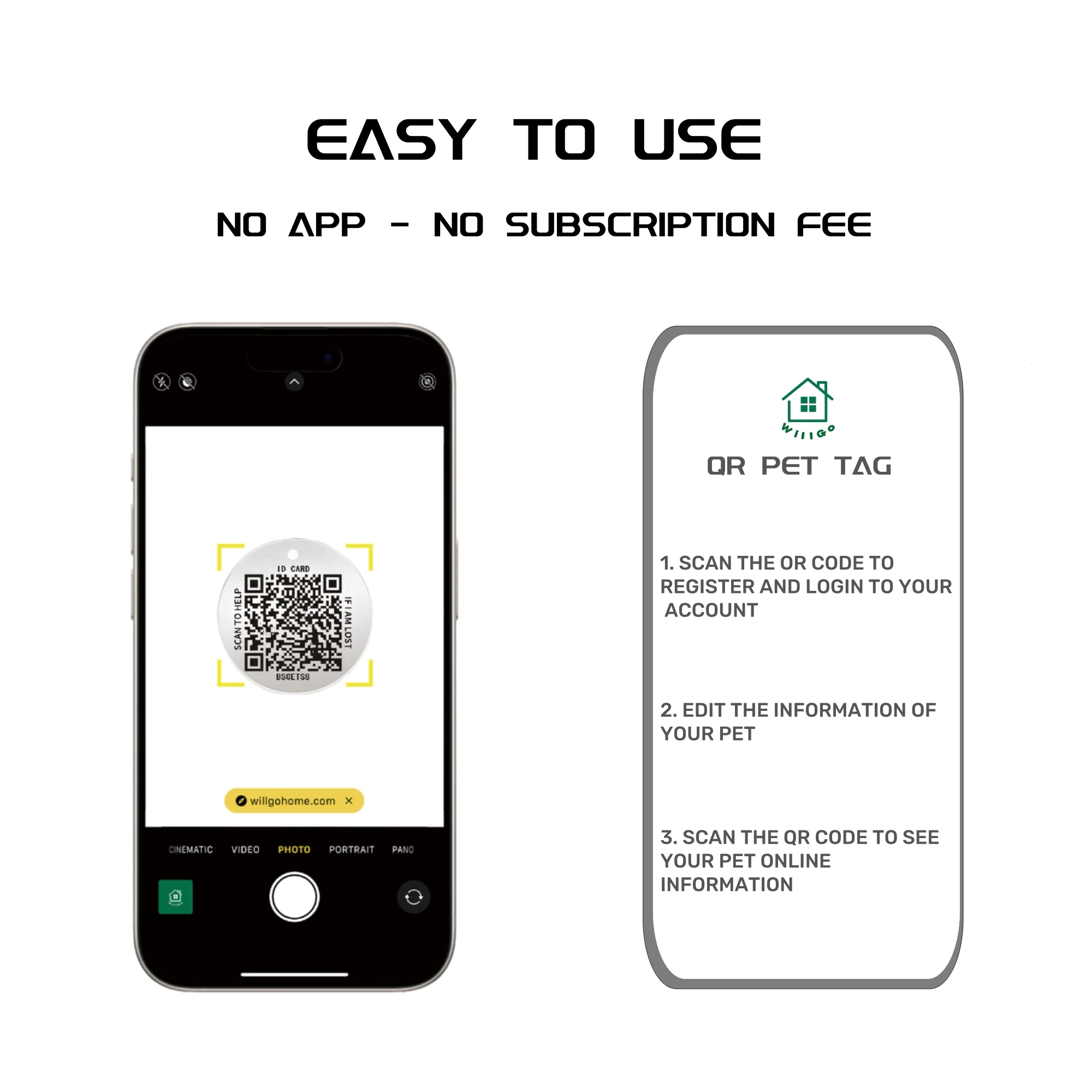 Activate the tag effortlessly by scanning the QR code. No app is needed—simply link to a free pet profile page and manage multiple pets from a single account.